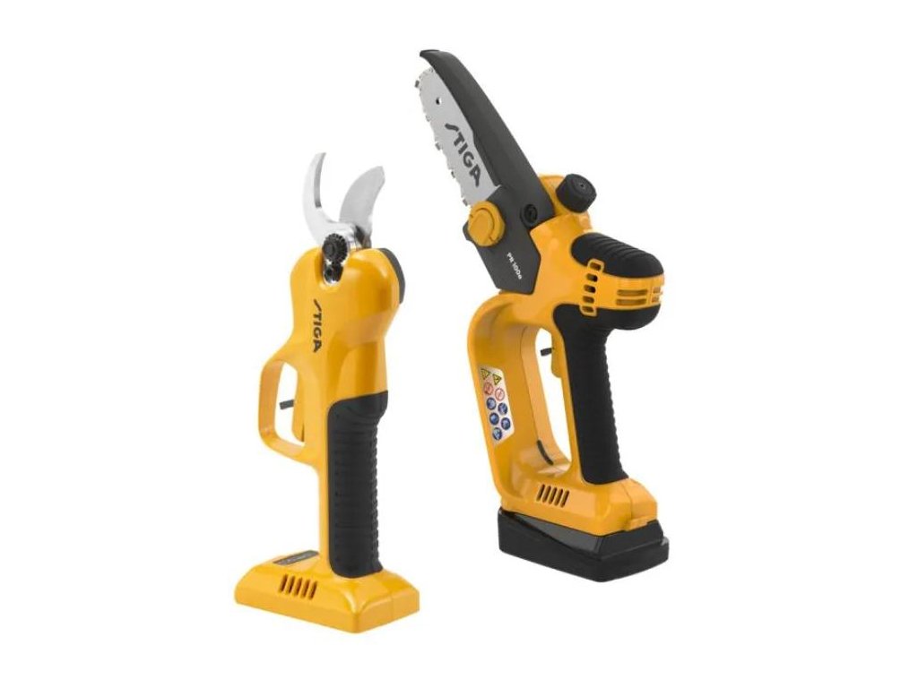 Set akumulátorových výrobků Stiga SP 100e Kit se skládá z aku nůžek a prořezávací pily. Sestava se dodává včetně akumulátoru a nabíječky.