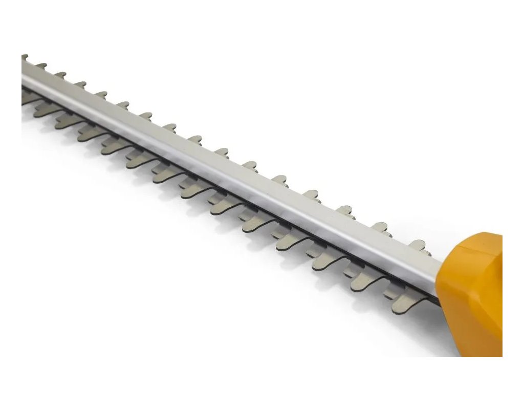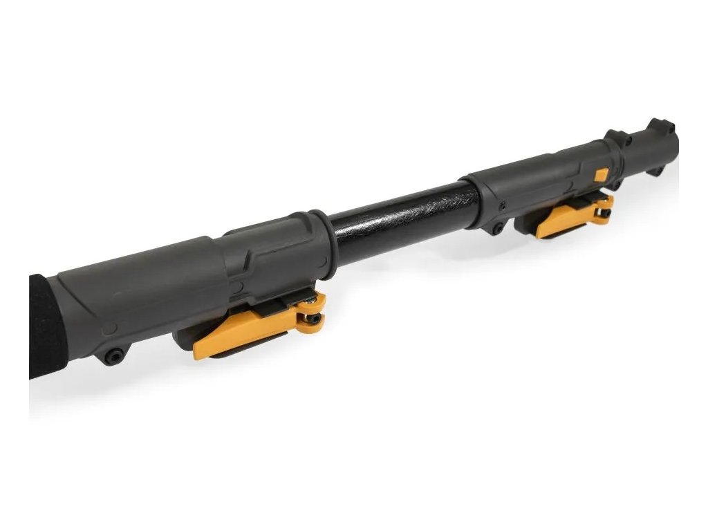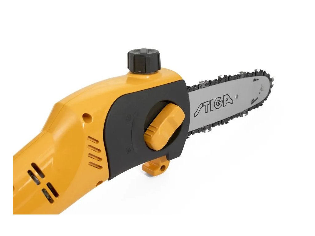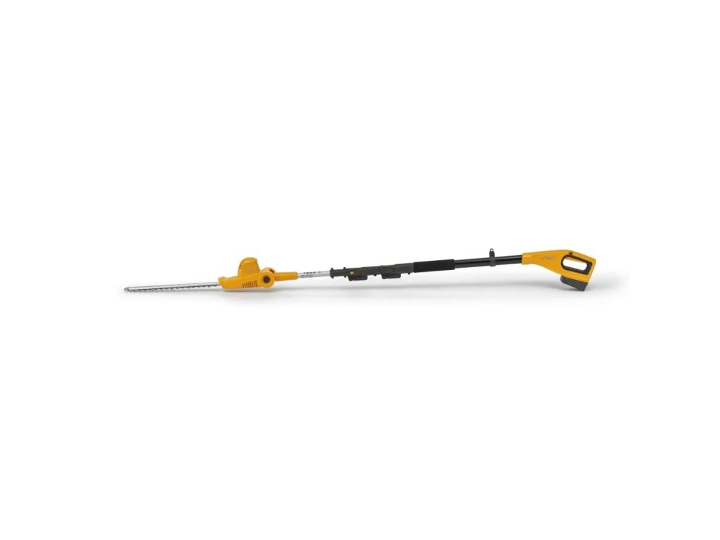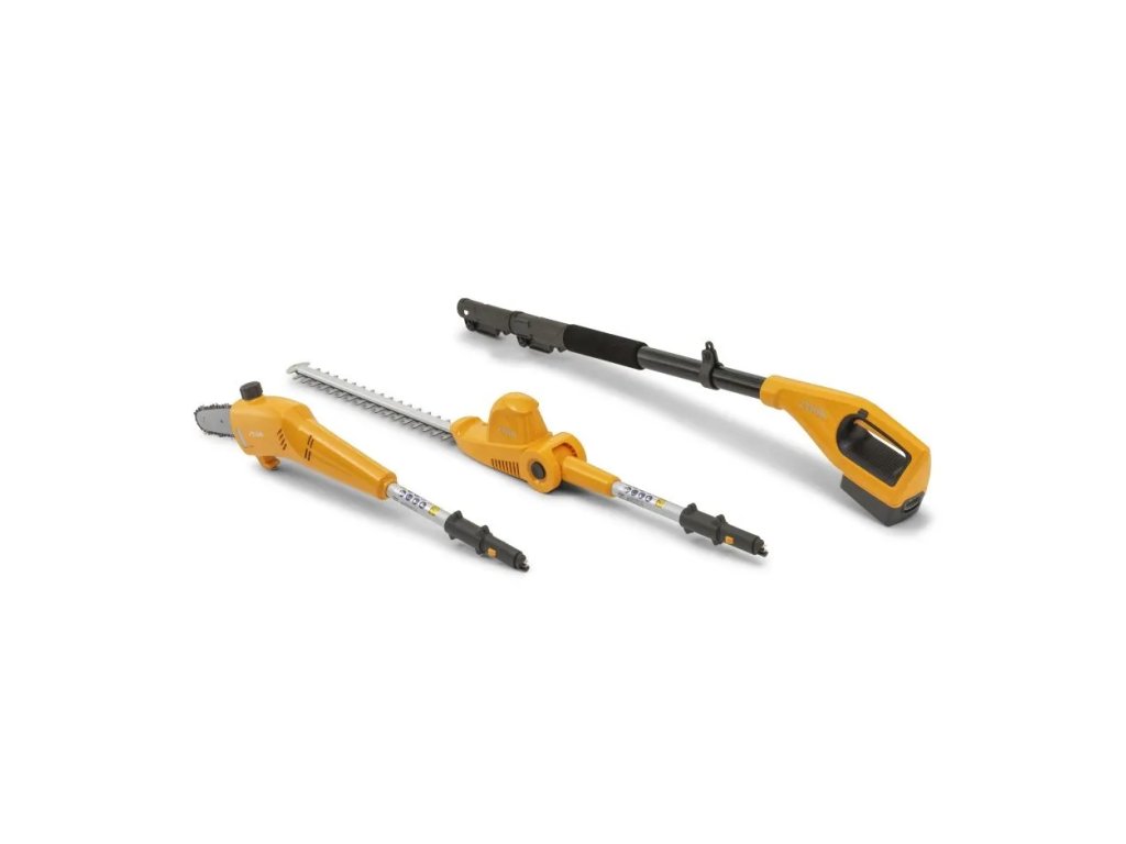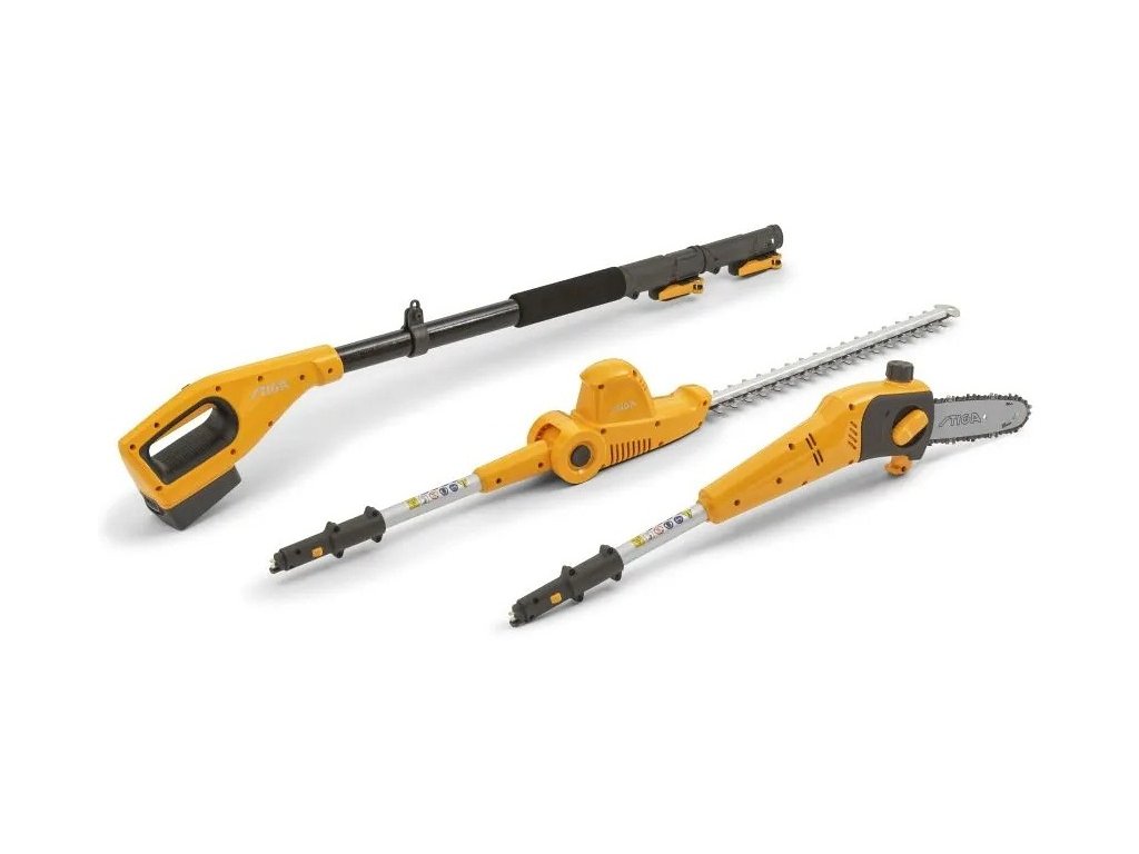 - 55cm teleskopické prodloužení – uživatel může nástrojem dosáhnout do výšky 2,75 m (nůžky na živý plot) a 2,55 m (prořezávací pila)