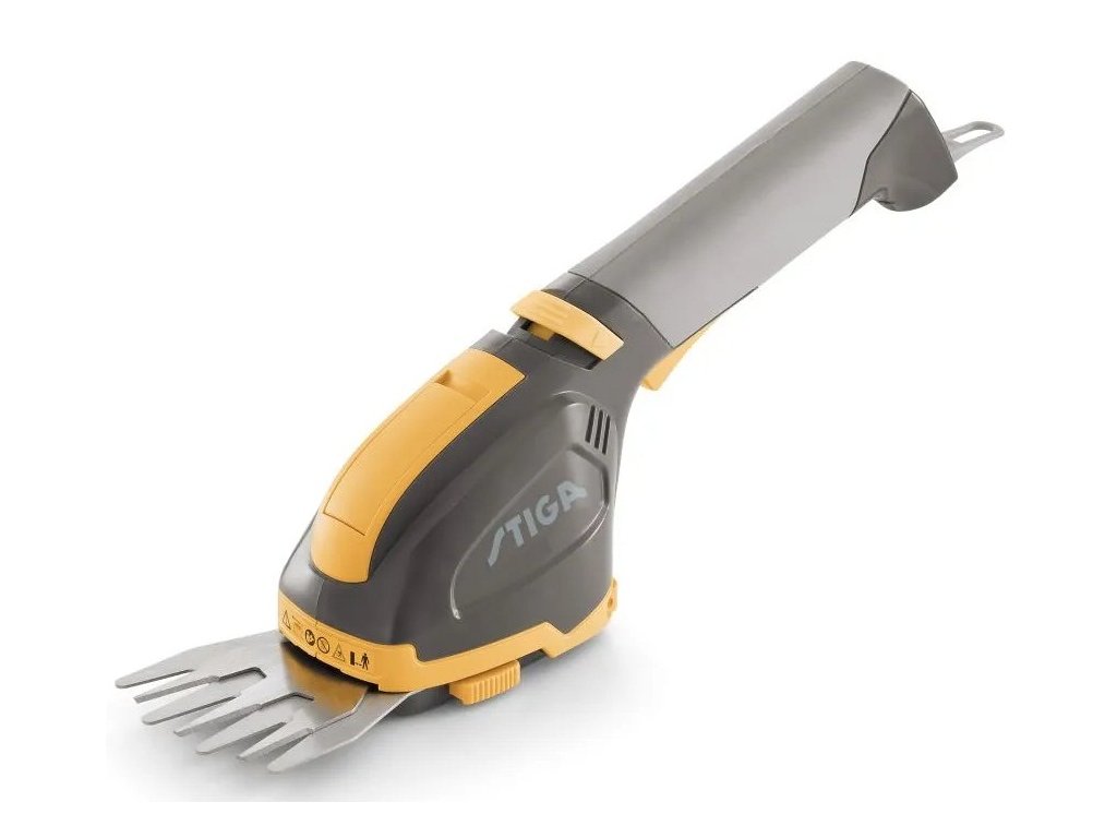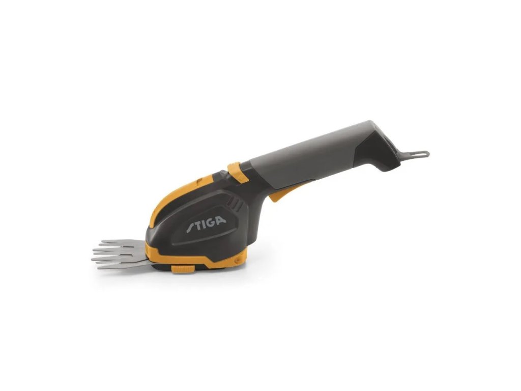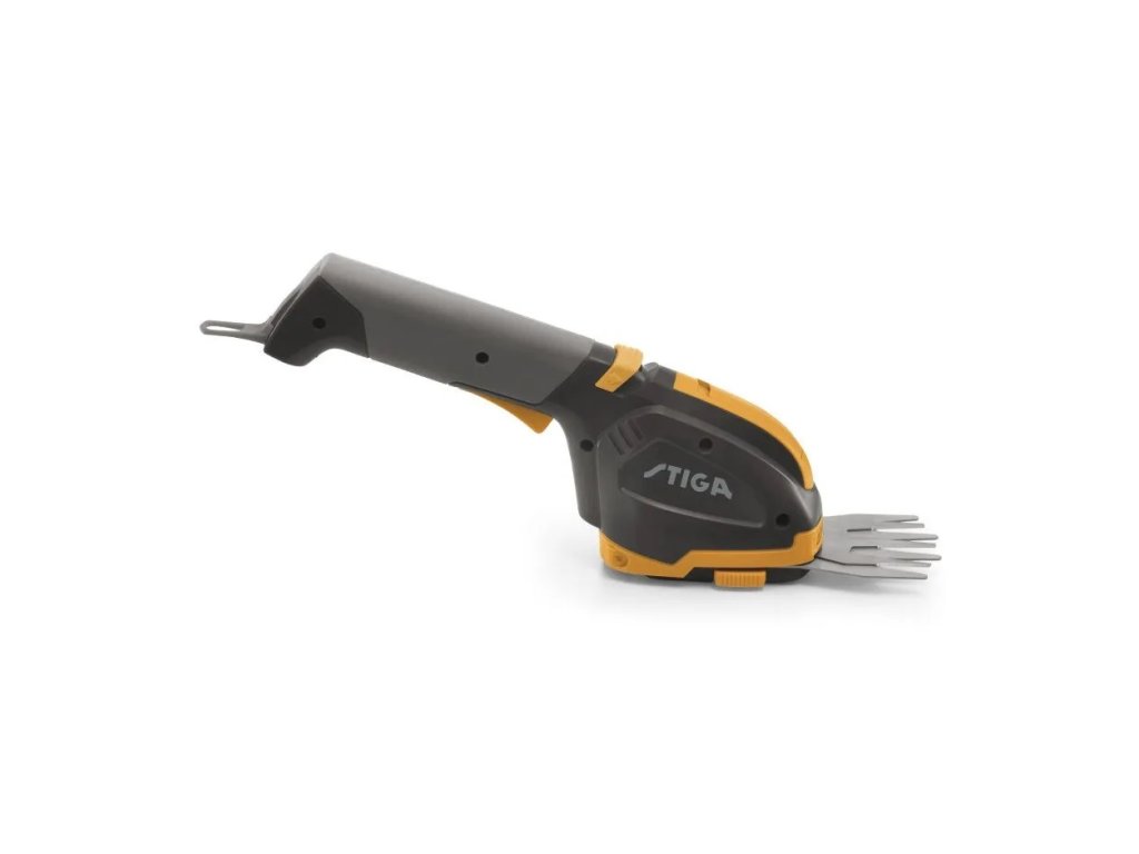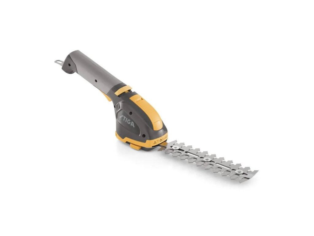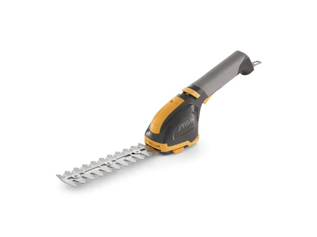 Bateriový multi-tool Stiga SGM 72 AE je multifunkční nástroj napájený akumulátorem s nožem pro sečení okrajů o délce 8 cm a nožem pro zastřihávání živých plotů o délce 18 cm.
